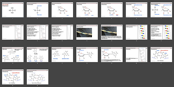 - Folien 1 bis 10: Bau des DNA-Rückgrats; Funktion von Phosphorsäure und Desoxyribose.