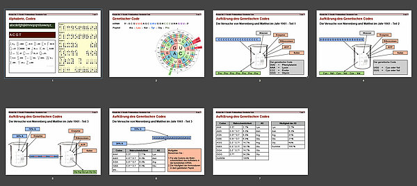 Hier sehen Sie die Folie 3 aus der Präsentation "Aufklärung des genetischen Codes". Hier werden vor allem die Versuche von Nierenberg und Matthei aus dem Jahre 1961 thematisiert. Einen Überblick über den gesamten Foliensatz sehen Sie im nächsten Bild: