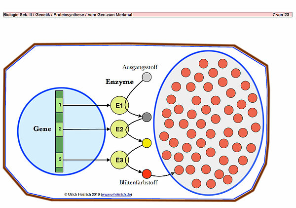 Hier sehen Sie die Folie 7 aus der Präsentation "Vom Gen zum Merkmal". Einen Überblick über den gesamten Foliensatz sehen Sie im nächsten Bild: