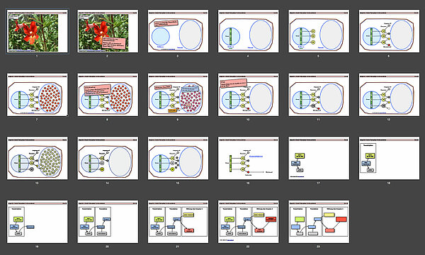 Im Unterricht können Sie diese Präsentation gut zum Einstieg in das große Thema "Proteinsynthese" verwenden. Aus diesem Grund ist die Präsentation auch recht kleinschrittig gehalten, so dass möglichst viele Schüler(innen) Gelegenheit haben, einen Unterrichtsbeitrag zu leisten, wenn sie das jeweilige Bild beschreiben sollen.