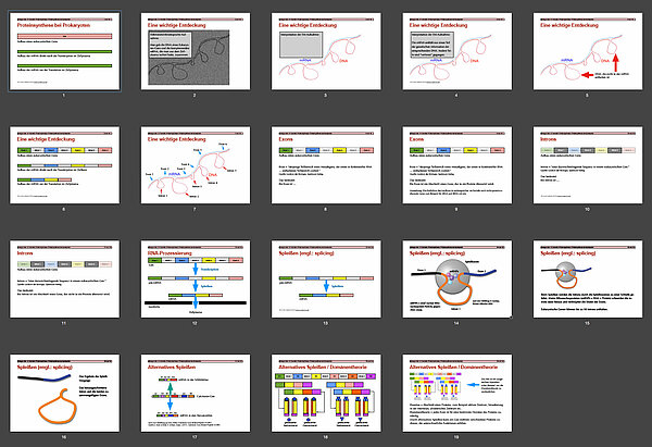 Neben dieser eher für den Grundkurs bestimmten Version habe ich kürzlich auch eine Version für den Leistungskurs entwickelt. In dieser Version wird zusätzlich auf weitere Schritte des mRNA-Editing eingegangen: Capping, Editing und Polyadenylierung. Dieser Foliensatz besteht dann aus den 19 Folien der GK-Version mit zusätzlichen 11 Folien.