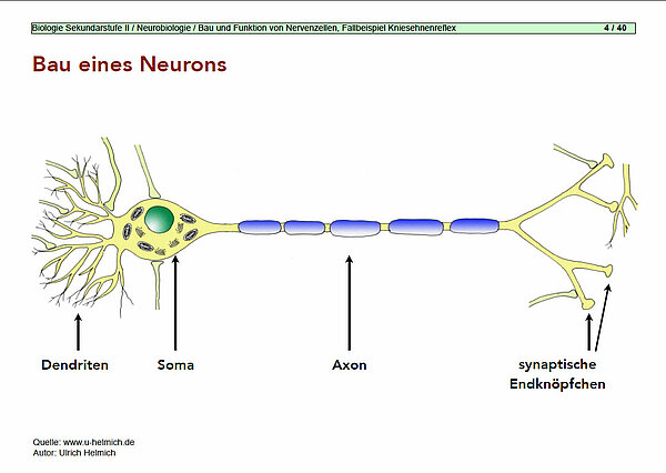 Zunächst wird der Aufbau eines Motoneurons vorgestellt, dann wird auf die Funktion der einzelnen Abschnitte des Neurons eingegangen. Danach wird die Typenvielfalt der Neurone thematisiert und auf die Einteilung der Neurone eingegangen. Als Anwendung der gelernten Kenntnisse wird dann das Fallbeispiel Kniesehnenreflex herangezogen. Auf vielen einzelnen Folien wird dann der gesamte Vorgang ausführlich erläutert.