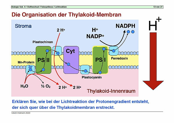 Hier wird der Aufbau der Thylakoid-Membran erklärt (siehe auch Bild oben, das die Folie 13 zeigt). Die wichtige Aufgabe für die Schüler(innen) ist hier, zu erklären, wie der Protonengradient entsteht. Die Informationen dazu können sie der Folie 13 entnehmen. Auf den folgenden Folien werden dann die drei Ursachen des Protonengradienten besprochen.