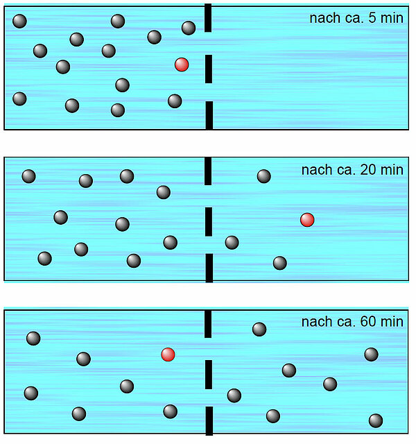 Das rot markierte Teilchen soll demonstrieren, dass eine Diffusion keine Einbahnstraße ist, sondern dass ein Teilchen auch mal wieder auf die andere Seite zurückdiffundieren kann. Schließlich beruht die Diffusion ja auf der zufälligen, nicht-zielgerichteten Bewegung vieler einzelner Teilchen (BROWNsche Molekularbewegung).