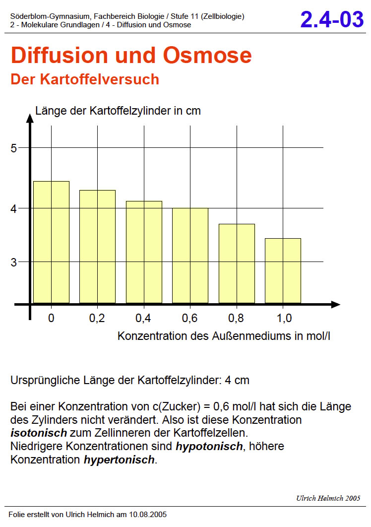 Bei einer Konzentration von > 0,6 mol/l ist die Zuckerlösung hyperton gegenüber den Kartoffelzellen, also diffundiert Wasser aus den Kartoffelzellen in die Zuckerlösung. Die Kartoffelzellen werden dadurch kleiner (auch hier wieder begrenzt durch die starre Zellwand), und die Kartoffelzylinder schrumpfen.