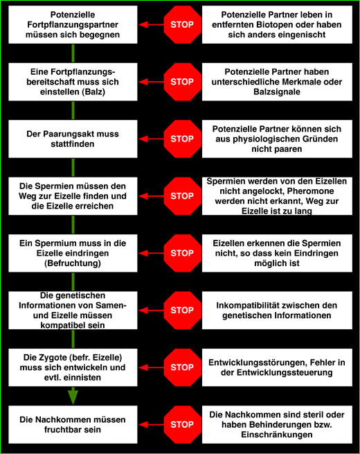 Die obige Graphik zeigt, auf welchen Ebenen der Fortpflanzung Isolationsmechanismen "greifen" können.