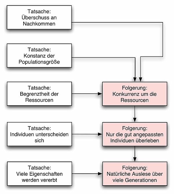 Was ist nun die Leistung Darwins? Sämtliche Tatsachen waren bereits vor Darwin bekannt. Und die erste Schlussfolgerung, dass ein Konkurrenzkampf um die Ressourcen stattfindet, ein "Kampf ums Überleben" oder "struggle for life", stammt nicht von Darwin, sondern von Malthus. Darwins Leistung waren die beiden darauf aufbauenden Schlussfolgerungen, dass nämlich nur die am besten angepassten Individuen diesen Konkurrenzkampf überleben und dass die Eigenschaften, die ihnen dieses Überleben ermöglichten, an die nachkommende Generation weitergegeben wird, so dass im Laufe der Generationen eine natürliche Auslese stattfindet.