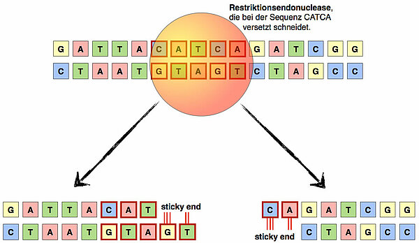 Das Enzym erkennt eine spezifische Stelle auf der DNA, die in unserem Beispiel durch die Nucleotidsequenz CATCA auf dem oberen Strang gekennzeichnet ist. An dieser Stelle wird die DNA durchtrennt, und zwar so, dass sticky ends entstehen. Darunter vesteht man "klebrige Enden": Die DNA wird nicht glatt durchschnitten, sondern es bleiben einsträngige Bereiche an jedem Ende über. Diese Einstrang-Bereiche können sich nun sehr leicht mit komplementären DNA-Abschnitten paaren und so wieder Doppelstränge bilden.