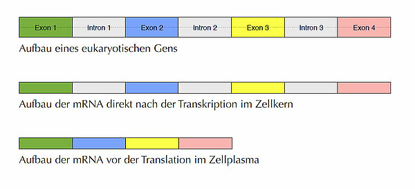 Auf dem Bild sehen wir die DNA eines Gens, die aus vier Exons und drei Introns besteht. Bei der Transkription wird eine einsträngige Abschrift der gesamten DNA des Gens angefertigt, die prä-mRNA des Gens enthält daher alle Exons, aber auch alle Introns. Die mRNA des gleichen Gens, wenn sie im Cytoplasma ankommt, besteht aber nur noch aus den vier Exons. Also müssen die drei Introns irgendwo auf dem Weg vom Zellkern zum Cytoplasma verloren gegangen sein.