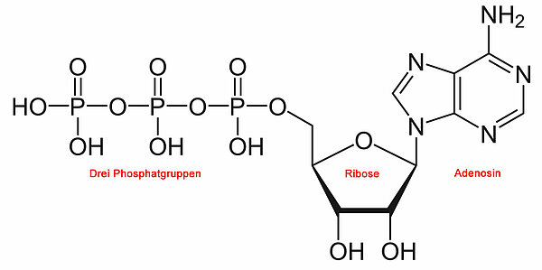 Der Einbau eines Nucleotids in ein Polynucleotid kostet Energie. In der Stufe EF haben Sie sicherlich gelernt, dass Phosphatgruppen eine Möglichkeit der Energiespeicherung darstellen. Die universelle Energiewährung der Zelle ist bekanntlich das ATP, das Adenosintriphosphat. Das ATP-Molekül besteht aus drei Komponenten: Der Base Adenosin, einem Ribose-Molekül und einer Phosphatgruppe.