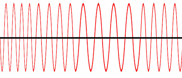 Bei einer Frequenzmodulation bleibt die Amplitude der Welle konstant, also die Höhe der Wellenberge bzw. -täler. Aber die Anzahl der Wellenberge bzw. -täler pro Sekunde, die sogenannte Frequenz, verändert sich in Abhängigkeit von der zu übermittelnden Information.