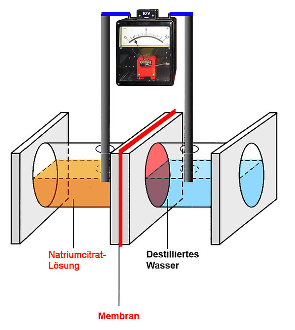 Der Versuch wird genauso aufgebaut wie der Modellversuch 1 zum Ruhepotenzial. Nur wird die linke Kammer diesmal nicht mit verdünnter Salzsäure gefüllt, sondern mit einer Kaliumcitrat-Lösung.