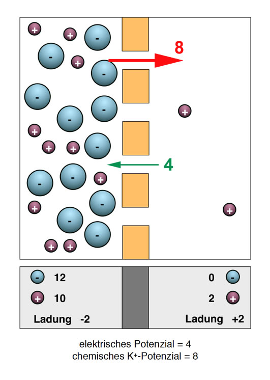 Links haben wir jetzt eine positive Ladung weniger als vorher, die Gesamtladung beträgt also -1. Rechts haben wir entsprechend eine positive Ladung mehr als zuvor, also beläuft sich die Gesamtladung rechts auf +1. Die Ladungsdifferenz - das elektrische Potenzial - hat damit den Wert -2. Das negative Vorzeichen soll darauf hinweisen, dass das elektrische Potenzial dem chemischen Potenzial entgegengerichtet ist. Die negative Gesamtladung der linken Seite wirkt anziehend auf die Kalium-Ionen der rechten Seite.