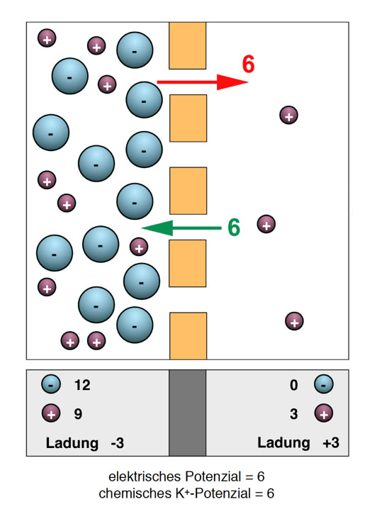 Nach der Diffusion von fünf Kalium-Ionen hat sich in unserem Modellsystem ein elektrochemisches Gleichgewicht eingestellt. Das elektrische Potenzial ist genau so groß geworden wie das chemische Potenzial. Das chemische Potenzial treibt die K+-Ionen nach rechts, das elektrische Potenzial dagegen zieht sie nach links. Dadurch heben sich die beiden Potenziale auf, es herrscht ein Gleichgewichtszustand!