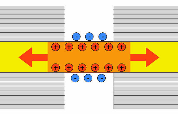 Hier sehen wir ein markloses Axon mit einem Abschnitt, in dem gerade ein Aktionspotenzial herrscht. Die Membraninnenseite ist positiv geladen, die Außenseite negativ. Die Ladungen breiten sich nach links und rechts aus (Diffusion, Konzentrationsausgleich), was durch die roten Pfeile angedeutet wird. Allerdings ziehen die negativen Ladungen der Membranaußenseite die positiven Ladungen der Innenseite an, weil die Membran ziemlich dünn ist. Daher wird die Diffusion der Ladungen ziemlich abgebremst.
