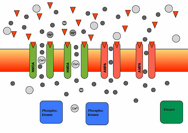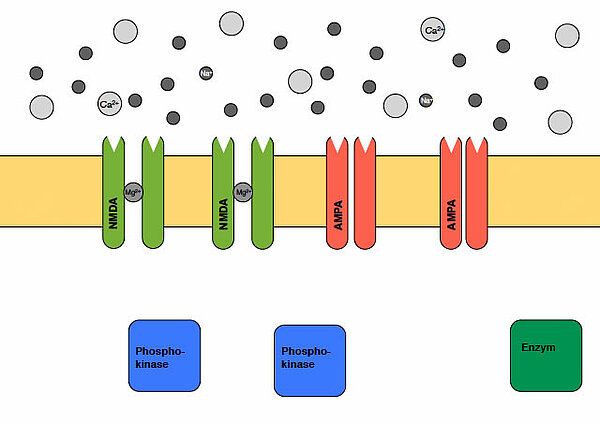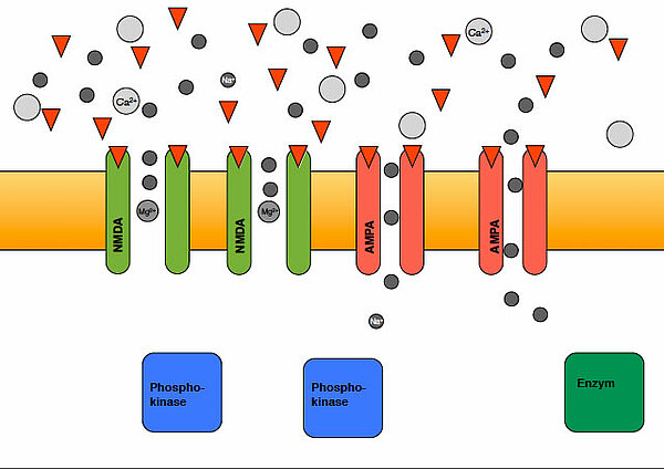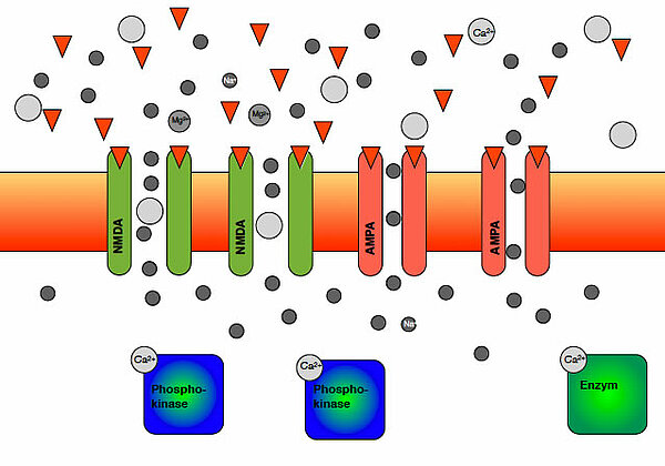Allerdings sind die NDMA-Kanäle durch Magensium-Ionen verschlossen, wie die Zeichnung oben zeigt. Bei den Ionenkanälen der AMPA-Rezeptoren ist das nicht der Fall, hier können die Calcium-Ionen (und Natrium-Ionen) ungehindert einströmen, wenn die Kanäle durch Glutamat aktiviert werden: