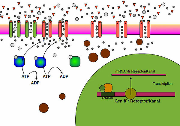 Bei der Langzeitpotenzierung an Glutamat-Synapsen bewirken die einströmenden Calcium-Ionen über second messenger eine Aktivierung bestimmter Gene im Zellkern, so dass neue Rezeptoren bzw. Ionenkanäle in die postsynaptische Membran eingebaut werden können, was die Signalübertragung an der Synapse effektiver macht.