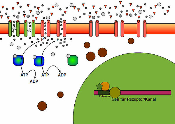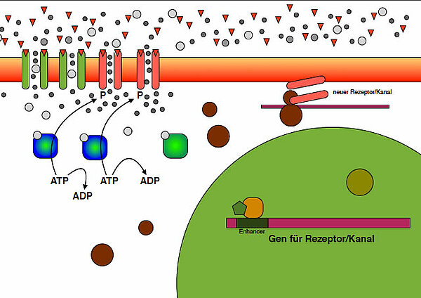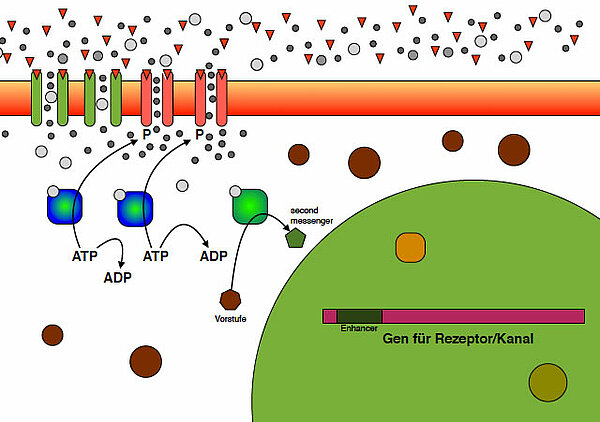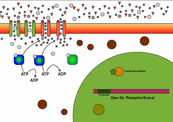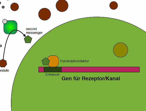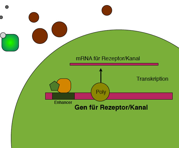 Hier sieht man, wie sich der aktivierte Transkriptionsfaktor an den für das Rezeptor/Kanal-Gen zuständigen enhancer gesetzt hat.