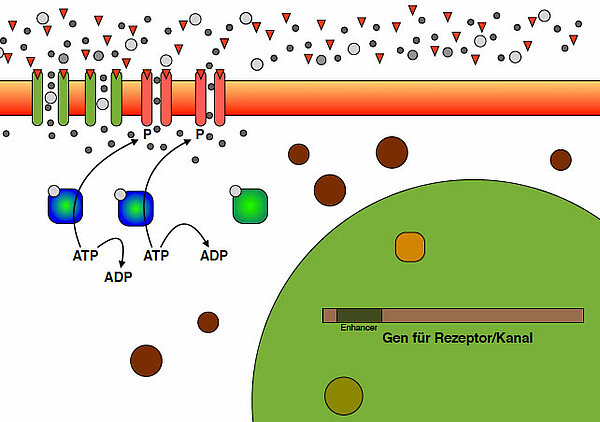 Hier sieht man zwei Phosphokinasen in Aktion. Die Phosphat-Ionen werden an die AMPA-Kanäle "angehängt", dadurch steigt deren Durchlässigkeit für Calcium- und Natrium-Ionen.