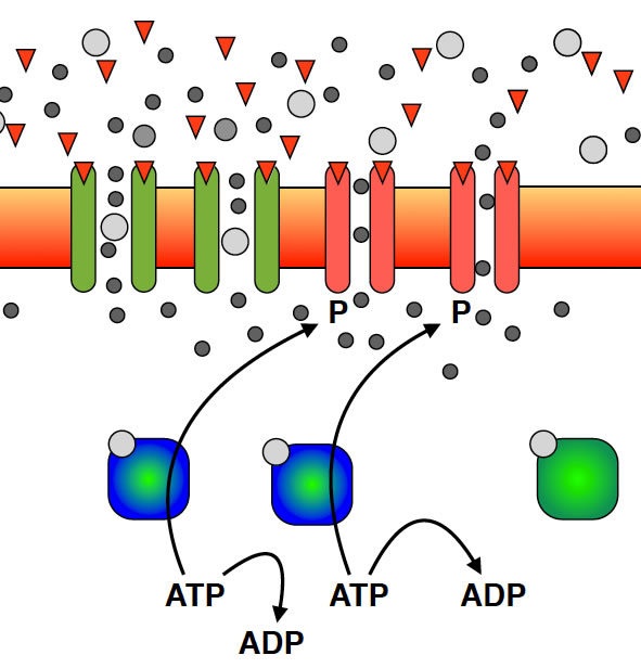 Die Calcium-Ionen setzen sich an bestimmte Enzyme des Cytoplasmas der postsynaptischen Zelle, vor allem an Proteinkinasen. Proteinkinasen sind Enzyme, die ein ATP-Molekül in ADP und Phosphat spalten. Das Phosphat hängen sie dann an ein anderes Protein an und aktivieren dies dadurch. Vor allem die Proteinkinase C muss hier genannt werden.