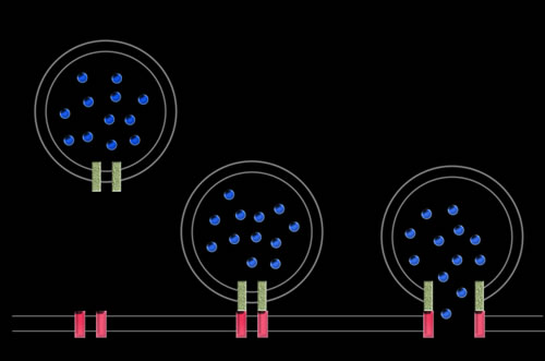 Links im Bild sieht man ein synaptisches Vesikel, das sich der präsynaptischen Membran (unten) nähert. Gelbgrün gezeichnet ist ein spezifische Protein des synaptischen Vesikels, und rot gezeichnet ist ein Protein der präsynaptischen Membran. Beide Proteine passen zueinander wie ein Schlüssel in das Schloss. Durch Transportproteine wird das synaptische Vesikel zur präsynaptischen Membran hingezogen. Die beiden komplementären Proteine verbinden sich. Nun bewegen sich die beiden Protein-Einheiten der präsynaptischen Membran auseinander und nehmen dabei die beiden Protein-Einheiten des Vesikels mit. Das Vesikel öffnet sich und ergießt seinen Inhalt, die Neurotransmitter, in den synaptischen Spalt.