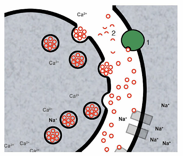 Die Calcium-Ionen, die in das Endknöpfchen geströmt sind, müssen am Ende des Prozesses wieder unter ATP-Verbrauch hinausgepumpt werden. Dazu befinden sich Calcium-Pumpen im synaptischen Endknöpfchen, die - Sie haben es schon erraten - auch wieder nicht in der Abbildung zu sehen sind.