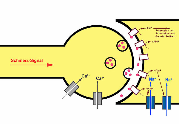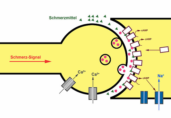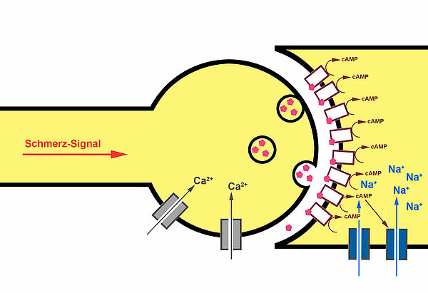 Das Schmerzsignal wird am Axon der Senderzelle mit Hilfe vieler Aktionspotenziale übertragen; schließlich kommt es am synaptischen Endknöpfchen an. Calcium-Ionen strömen ein und bewirken eine Fusion der synaptischen Vesikel mit der präsynaptischen Membran. Die Neurotransmitter werden in den synaptischen Spalt entlassen und setzen sich an Rezeptoren der postsynaptischen Membran. Über G-Proteine werden Adenylatcyclasen aktiviert, die den sekundären Botenstoff cAMP herstellen. Die cAMP-Moleküle setzen sich an Natrium-Kanäle, diese öffnen sich, und Natrium-Ionen diffundieren in die Empfängerzelle. Diese wird depolarisiert und leitet die Schmerz-Information weiter.