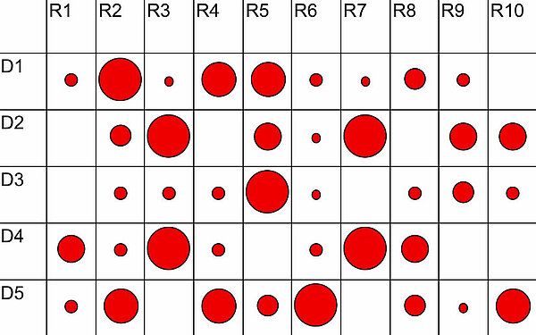 Dann wurde die Nase des Versuchstiers - vermutlich eine weiße Ratte - fünf verschiedenen Duftstoffen D1 bis D5 ausgesetzt. Dabei registrierte man die Rezeptorpotenziale der zehn Mitralzellen.