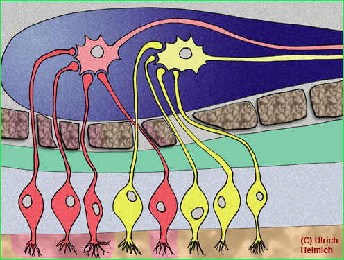 Die Axone der Riechsinneszellen ziehen durch das Siebbein in den Riechkolben. Dort befinden sich die Mitralzellen. Das sind Neurone, die für einen bestimmten Geruch "zuständig" sind. Alle Riechsinneszellen mit dem gleichen Duftstoffrezeptor sind mit derselben Mitralzelle verbunden. In der Abbildung oben sind die "roten" Duftstoffrezeptoren mit der roten Mitralzelle verbunden, und die gelben Duftstoffrezeptoren mit der gelben Mitralzelle.