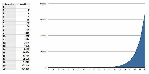 Ich habe hier mit einer Tabellenkalkulation die Entwicklung einer E. coli-Kolonie über einen Zeitraum von zwanzig Generationen (also gut sechs Stunden) berechnen und graphisch darstellen lassen. Nach gut sechs Stunden gibt es bereits eine halbe Million Zellen, 20 Minuten später ca. 1 Million Zellen.