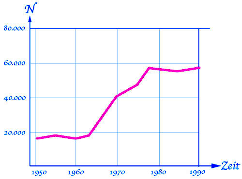 Hier sehen wir ein typisches Beispiel für "echtes" logistisches Wachstum. Dargestellt ist das Wachstum einer Vogelpopulation in Bayern - die Quelle für diese Zahlen ist mir leider nicht mehr bekannt (wenn ich danach recherchiere, komme ich immer wieder auf meine eigene Seite). Die Übergänge zwischen den drei Phasen des Populationswachstums sind nicht so schön zu sehen wie in der Theorie, aber mit viel Phantasie kann man eine logistische Kurve in den tatsächlichen Graphen legen.