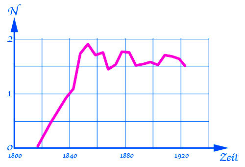 Dies ist das berühmte Beispiel der Schafe in Tasmanien. Die Zahlen auf der y-Achse bedeuten Millionen. Auch hier kann man sich mit viel Phantasie eine logistische Wachstumskurve denken.