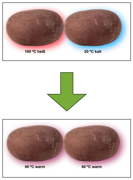 Hier sehen wir zwei Steine. Der linke Stein wurde auf 100 Grad Celsius erhitzt, der andere hat Zimmertemperatur, ist also relativ kalt. Beide Steine liegen direkt nebeneinander, so dass sie sich berühren. Geht man nun für längere Zeit aus dem Zimmer, um beispielsweise eine Webseite über Entropie zu schreiben, und kommt dann zurück, so hat sich der linke Stein abgekühlt, während sich der rechte erwärmt hat. Im Idealfall (der also nie eintritt) haben beide Steine am Ende die gleiche Temperatur; rein rechnerisch müssten sie 60 Grad warm sein. Praktisch denkende Menschen werden jetzt natürlich einwenden, dass beide Steine mit der Zeit abkühlen und dann nicht mehr 60 Grad warm sind - aber das soll uns jetzt egal sein. Das Grundprinzip habe ich hoffentlich verdeutlicht: Vorher herrschte ein Zustand hoher Ordnung = geringer Entropie, der eine Stein war heiß, der andere kalt, ein recht unwahrscheinlicher Zustand. Nach dem Wärmeausgleich herrscht ein Zustand geringer Ordnung = hoher Entropie, es ist viel wahrscheinlicher, dass zwei nebeneinander liegende Steine die gleiche Temperatur haben, als dass sie unterschiedliche Temperaturen besitzen.