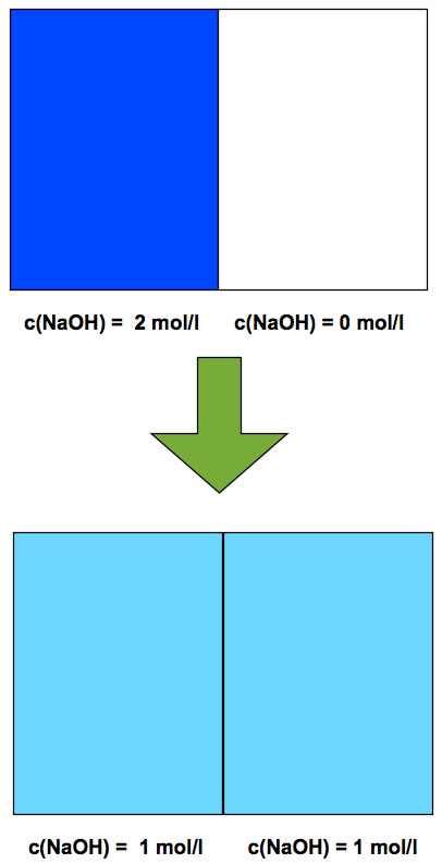 Ein Beispiel aus dem Chemie-Labor. Ein Glasgefäß wird durch eine permeable Membran in zwei Hälften geteilt. In die linke Hälfte des Gefäßes wird Natronlauge der Konzentration c(NaOH) = 2 mol/l gefüllt, in die rechte Hälfte destilliertes Wasser. Hier ist die Konzentration c(NaOH) = 0 mol/l. Die Membran ist durchlässig für Wasser-Moleküle sowie Natrium- und Hydroxid-Ionen. Diese Teilchen diffundieren entlang ihrer Konzentrationsgradienten, und nach einiger Zeit kommt es zu einem Konzentrationsausgleich, in beiden Hälften des Gefäßes herrscht die gleiche Konzentration von c(NaOH) = 1 mol/l.