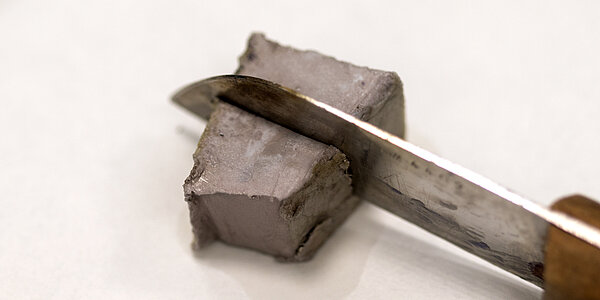 Außerdem ist Natrium ein sehr weiches Metall, man kann es mit dem Messer schneiden, leichter als Lithium. Es schmilzt bereits bei 98 ºC, also wesentlich eher als Lithium, und die Siedetemperatur beträgt 890 ºC, also ebenfalls niedriger als bei Lithium. Im Vergleich zu anderen "normalen" Metallen ist Natrium sehr reaktiv. An der Luft läuft es innerhalb weniger Minuten trüb an, und mit Wasser reagiert Natrium heftig unter Bildung von Wasserstoff.