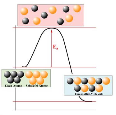 Die Anziehungskräfte zwischen den Eisen-Atomen einerseits und die Anziehungskräfte zwischen den Schwefel-Atomen andererseits müssen also überwunden werden. Dazu ist Energie notwendig - die Aktivierungsenergie, die oft mit Ea oder EA abgekürzt wird.