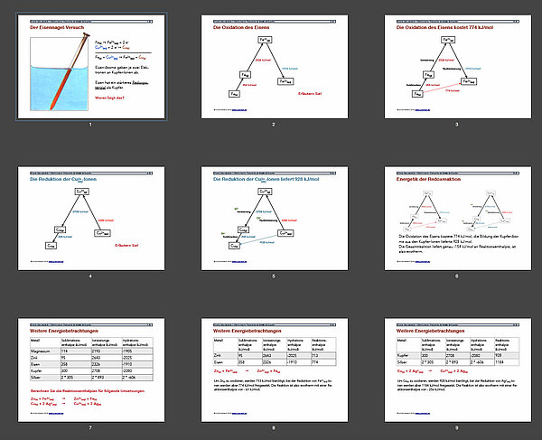 Hier ein Überblick über alle 9 Folien des Foliensatzes "Die Redoxreihe der Metalle für Experten". Im ersten Schritt wird berechnet, wie viel Energie/Enthalphie für die Oxidation des Eisens benötigt wird (endotherme Reaktion), im zweiten Schritt für ermittelt, welcher Energiebetrag für den umgekehrten Vorgang bei den Kupfer-Ionen notwendig ist (exotherme Reaktion).
