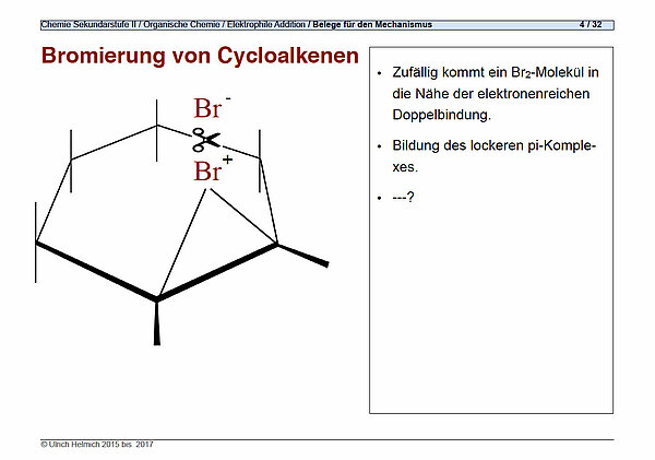 Dieser Foliensatz dient nun zur Erarbeitung des eigentlichen Reaktionsmechanismus auf gymnasialen Oberstufen-Niveau. Nachdem die elektrophile Addition am Beispiel der einfachen Hydrobromierung und der etwas komplexeren Bromierung in den Grundzügen erarbeitet wurde, werden nun Belege für den Reaktionsmechanismus vorgestellt und erarbeitet.