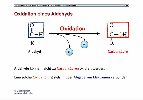 Sie können diesen Foliensatz in der Stufe EF oder auch bereits in der Stufe 9 einsetzen, wenn das Thema "Vom Alkohol zum Aldehyd" behandelt wird. Auf Oxidationszahlen wird in dieser Präsentation nicht eingegangen. Zu diesem Thema gibt es später noch eine eigene Präsentation.