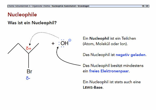 Sie können diesen Foliensatz in der Stufe Q1 einsetzen, vielleicht auch schon in der Stufe EF. Für die Behandlung der letzten Folien, wenn es um das Thema "Nucleophilie" geht, wäre es allerdings gut, wenn Ihre Schüler(innen) schon den Begriff der Lewis-Base kennen.