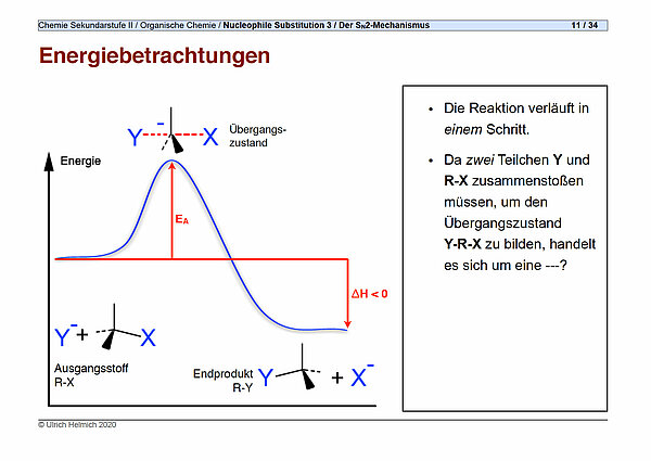 Seit einiger Zeit bin ich wieder angefangen, Präsentationen für den Chemie-Unterricht der Sekundarstufe II zu erstellen. Kolleginnen und Kollegen, die diese PDF-Präsentation "Nucleophile Substitution 3: Der SN2-Mechanismus" gegen eine kleine Kostenbeteiligung von 7 bis 10 Euro von mir erhalten möchten, schreiben mir eine Mail an ulrich.helmich@t-online.de. Den Betrag können Sie mir als Amazon-Gutschein oder besser noch als PayPal-Überweisung zuschicken.