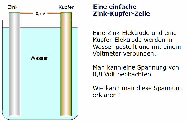 In ein Becherglas mit dest. Wasser werden eine Kupferelektrode und eine Zinkelektrode gestellt. Dann schließt man beide Elektroden an ein Voltmeter an.
