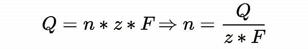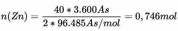 Dabei ist n die zu berechnende Stoffmenge in mol, Q ist die angegebene Kapazität, nämlich 40 * 3600 As (von Ah hochgerechnet), z ist die Ladung der Zink-Ionen, nämlich 2, und F ist die FARADAY-Konstante, nämlich 96.485 As/mol (im Material vorgegeben).