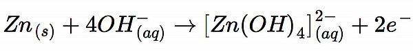 Die Komplikation bei den Elektrodenreaktion ist das stark alkalische Medium des Elektrolyten mit einer hohen Hydroxidionen-Konzentration. An der Zink-Elektrode läuft daher nicht die einfache und bekannte Reaktion