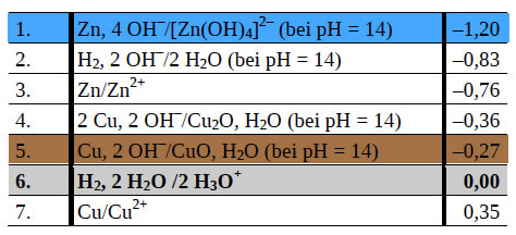 Hier sind die Zeilen 6 und 7 interessant. In der leicht sauren Lösung (Konzentration der Schwefelsäure ist nur 0,5 mol/l) gilt für die Kupfer-Elektrode die Zeile 7, solange noch genügend Kupfer-Ionen in der Lösung vorhanden sind. Sind diese aber aufgebraucht, kommt es zur Wasserstoff-Entwicklung, und dann ist aus der Kupfer-Elektrode plötzlich eine Wasserstoff-Elektrode geworden. Hierfür gilt die Zeile 6. Das Standardredoxpotenzial der Wasserstoff-Halbzelle ist aber um 0,35 Volt "kleiner" als das der Kupfer-Halbzelle, daher ist auch die gemessene Spannung um 0,35 Volt geringer.