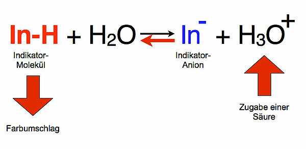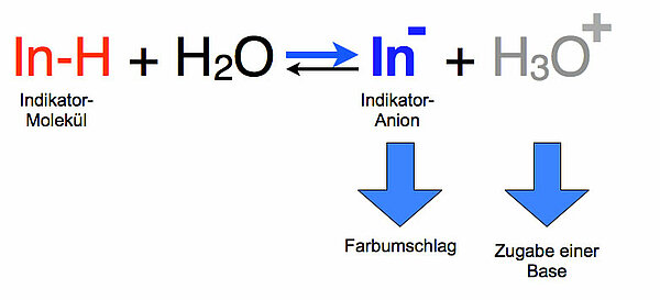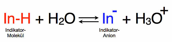 In der Regel ist der Indikator eine farbige Säure. Der Säurerest des Indikators, das Indikator-Anion In-, hat dann eine andere Farbe als das Indikator-Molekül InH.