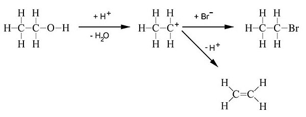 Wie man auf dem Bild gut sehen kann, ist die Dehydratisierung eine Eliminierungsreaktion, die in Konkurrenz zur Nucleophilen Substitution (SN1) abläuft. Auf der Seite "Alkohole: Dehydratisierung" der Chemgapedia findet sich ein schöner Videofilm, der die Eliminierung von Wasser aus Cyclohexanol zeigt. Industriell bedeutsam ist die Dehydratisierung von Alkohol in Ländern mit großer Bioethanol-Produktion, zum Beispiel Brasilien, Kolumbien oder USA.