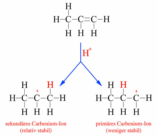 HydrohalogenierungSetzt man zur Addition nicht elementares Brom oder Chlor ein, sondern stattdessen Bromwasserstoff oder Chlorwasserstoff, so erhält man Monobrom- bzw. Monochloralkane. Der Mechanismus dieser Reaktion ist etwas einfacher als der der Bromierung oder Chlorierung, weil HBr bzw. HCl bereits Dipol-Moleküle sind, daher kann der Wasserstoff leicht als Proton abgespalten werden. Das Proton setzt sich dann an die C=C-Doppelbindung, wobei ein Carbenium-Ion entsteht. Beim Ethen gibt es nur eine Möglichkeit zur Bildung eines Carbenium-Ions, weil die beiden C-Atome des Ethens gleichwertig sind (beides sind primäre C-Atome). Beim Propen allerdings ist eines der C-Atome primär, das andere jedoch sekundär. Da sekundäre Carbenium-Ionen stabiler sind als primäre, setzt sich das Proton meistens an das primäre C-Atom, dann entsteht nämlich ein sekundäres Carbenium-Ion (Regel von Markownikow).