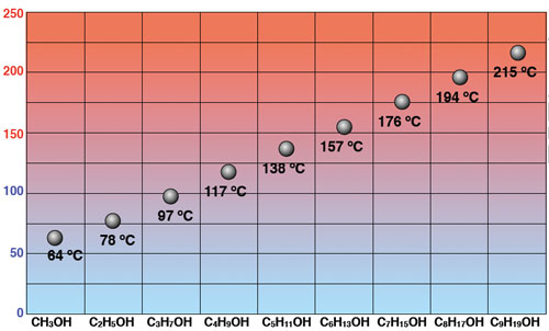 Vergleicht man die Siedetemperaturen von Alkanolen mit denen der entsprechenden Alkane, so stellt man fest, dass die Alkohole eine deutlich höhere Siedetemperatur haben. Zum Beispiel siedet n-Hexan bei 69 ºC, während Hexan-1-ol eine Siedetemperatur von 157 ºC hat. Die folgende Tabelle zeigt die Siedetemperatur der ersten zehn Alkanole:
