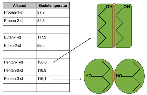 - Stellung der OH-Gruppe(n) im Molekül: Je langgestreckter das Molekül, desto größer die van-der-Waals-Kontaktfläche und desto höher der Siedepunkt; je "kugelförmiger" des Molekül, desto niedriger der Siedepunkt.